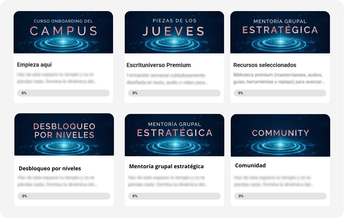 Sistema de soporte en directo: sesiones estratégicas con feedback real (revisión y dirección), masterminds y una sala privada para que las alumnas se acompañen con sesiones entre ellas.